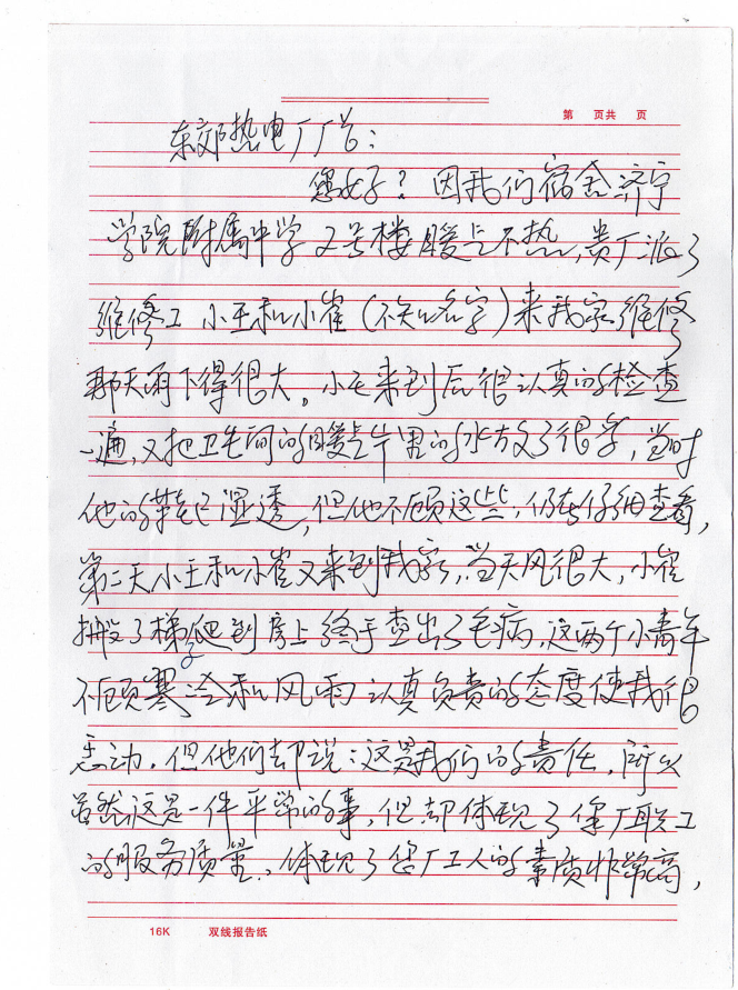 近日,山東聚源熱力公司收到一封來自濟(jì)寧學(xué)院附屬中學(xué)宿舍張老師寫的表揚(yáng)信,信中這樣寫道:“東郊熱電廠廠長(現(xiàn)為山東聚源熱力)您好,因我們宿舍濟(jì)寧學(xué)院附屬中學(xué)2號樓暖氣不熱,貴廠派了維修工小王和小崔(不知名字)來我家維修。那天雨下得很大,小王來到后很認(rèn)真的檢查一遍,又把衛(wèi)生間的暖氣片里的水放了很多,當(dāng)時他的鞋已濕透,但他不顧這些,仍在仔細(xì)查看。第二天小王和小崔又來到我家,當(dāng)天風(fēng)很大,小崔搬了梯子爬到房上終于查處了毛病,這兩個小青年不顧寒冷和風(fēng)雨認(rèn)真負(fù)責(zé)的態(tài)度,使我很感動,但他們卻說這是我們的責(zé)任。雖然這是一件平常的事,但卻體現(xiàn)了您廠職工的服務(wù)質(zhì)量,體現(xiàn)了您廠工人的素質(zhì)非常高,也體現(xiàn)了您廠的廠風(fēng)正,培養(yǎng)了這么好的職工,請領(lǐng)導(dǎo)對他們進(jìn)行表揚(yáng),號召全體職工向他們學(xué)習(xí)。弘揚(yáng)正氣,使我們的社會更加和諧?!?/span>